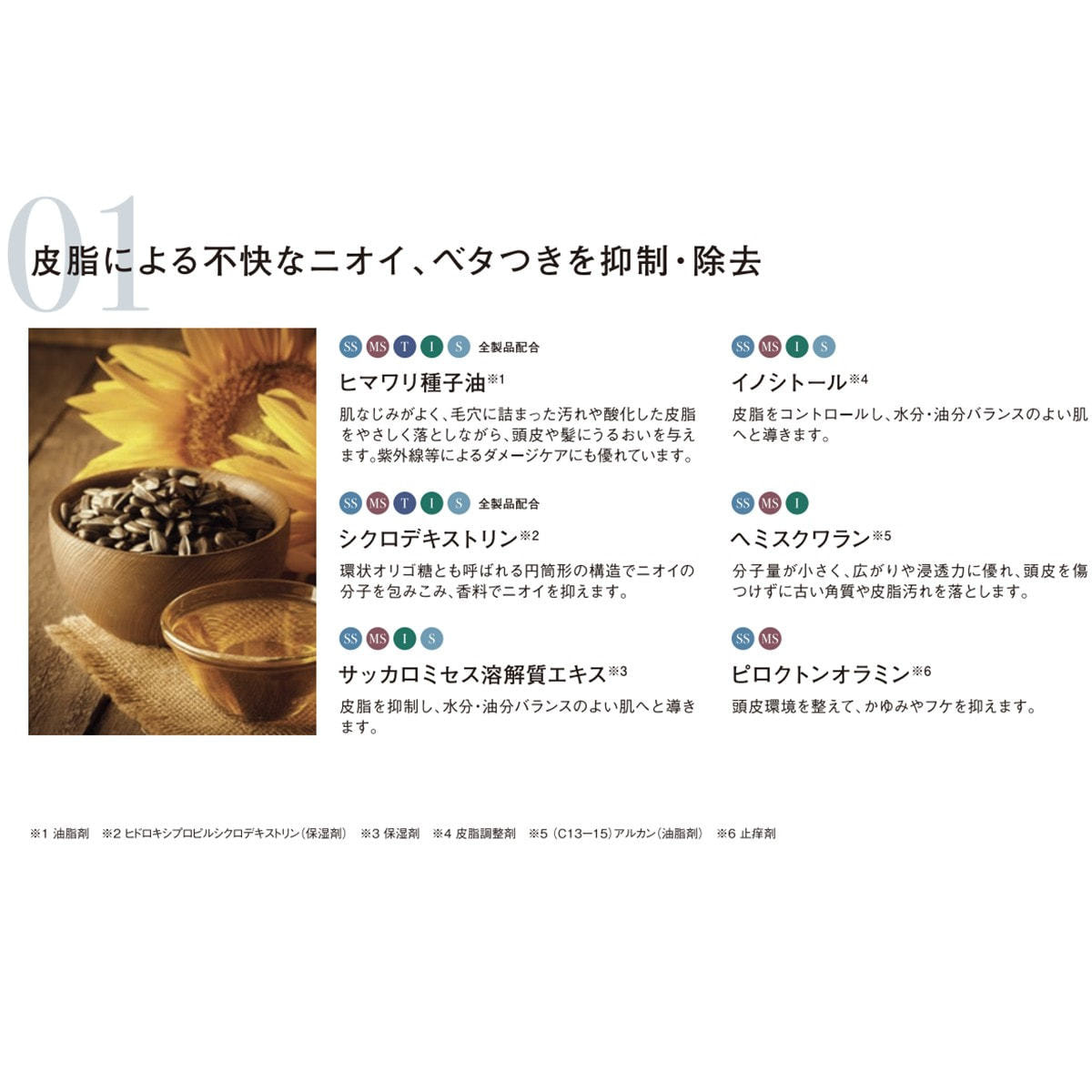 ※1油脂剤 ※2ヒドロキシプロピルシクロデキストリン ※3保湿剤 ※4皮脂調整剤 ※5(C-13)アルカン(油脂剤) ※6止痒剤
