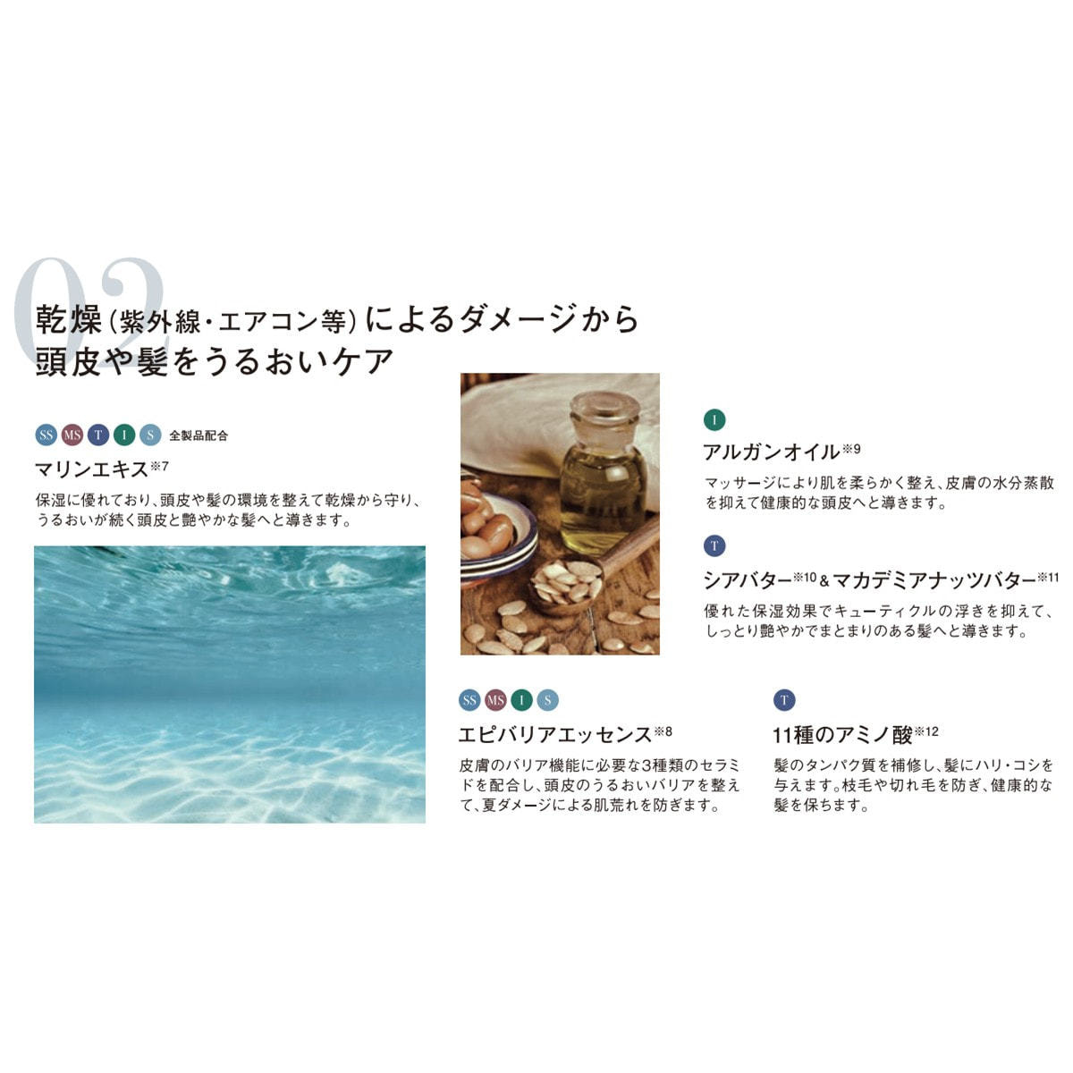 ※7 加水分解コラーゲン、サガラメエキス(以上保湿剤) ※8 水添レシチン、フィトステロールズ、セラミドNP、セラミドNG、セラミドAP(以上皮膚保護剤)、キサンタンガム(増粘剤)、グリセリン、ツボクサ葉エキス(保湿剤)、水、BG(以上溶剤) ※9 アルガニアスピノサ核油(油脂剤) ※10 シア脂(油脂剤) ※11(マカデミア種子油/水添マカデミア種子油)エステルズ(油脂剤) ※12 アルギニン、アスパラギン酸、グリシン、アラニン、セリン、バリン、プロリン、トレオニン、イソロイシン、ヒスチジン、フェニルアラニン(以上毛髪保護剤)